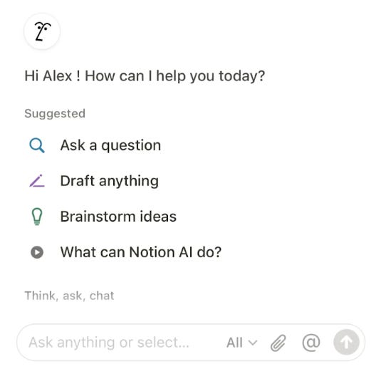 If providing prompt templates is too rigid or tedious for your product’s use cases, you can ask framing questions and/or show a short list of examples of intended use as seen here on Notion: