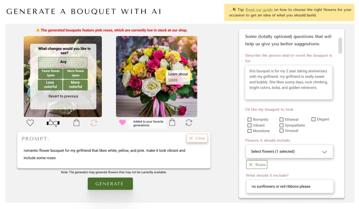 Here’s how I designed an optional prompting worksheet for one of my portfolio projects, an image generator for an imaginary flower shop I created for an online design course. To determine these parameters, I researched the typical thought process in selecting a flower bouquet to figure out what users look for.