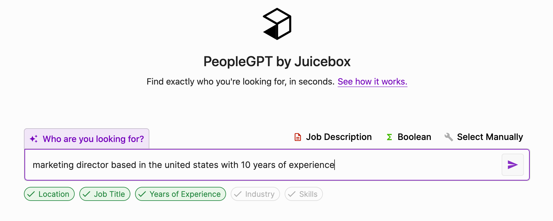 This strategy is especially useful for: content generation tools with predictable use cases that require a lot of details from the user, such as Jasper.ai. Like Jasper.ai, you can create multiple templates tailored to different purposes that your product offers. This strategy is also useful for tools like Juicebox or video generation platforms that consistently expect a certain prompt structure, such as location, tone, style, or years of experience.