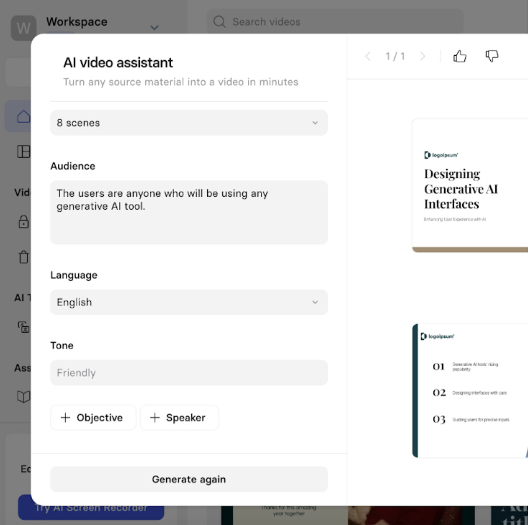 For example, AI video generator Synthesia features fields instructing the user to enter their video’s desired language, tone, and audience. Users have the option to provide additional information critical in video production, such as “objective” and “speaker”. This reduces ambiguity and guides users who are totally clueless about writing prompts.